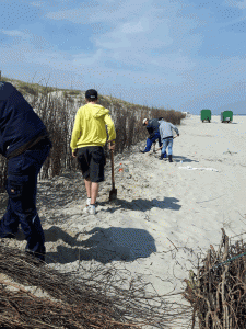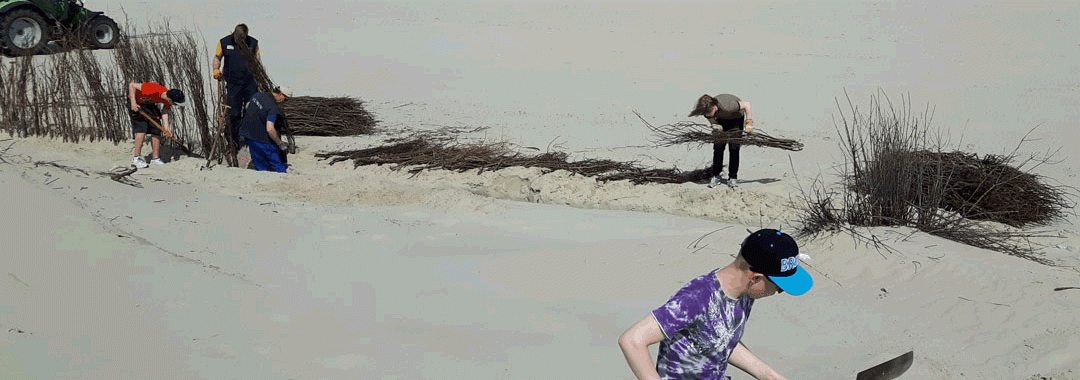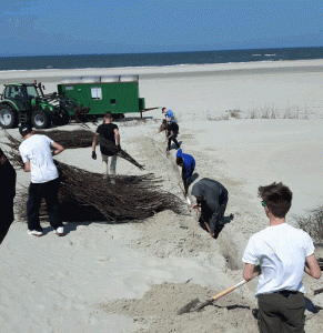 Ihre Aufgabe bestand darin, Dünenbefestigungen aus „Busch“ zu bauen, um damit die natürliche Erosion der Insel hinauszuzögern und die schöne Dünenlandschaft der Nordseeinsel vor Sturmfluten zu schützen. Dabei wurden die sechs Neuntklässler von ihren „Arbeitskollegen auf Zeit“ Michael, Lars und Heinz friesisch-freundlich angeleitet und unterstützt. Die drei Mitarbeiter des NLWKN waren zwischendurch immer bereit, kleine Exkurse zu den Bereichen Meeresbiologie, Küstenschutz und Inselleben zu machen, denen die Schüler auf ihre Schaufeln gestützt lauschen (und dabei verschnaufen) konnten.