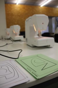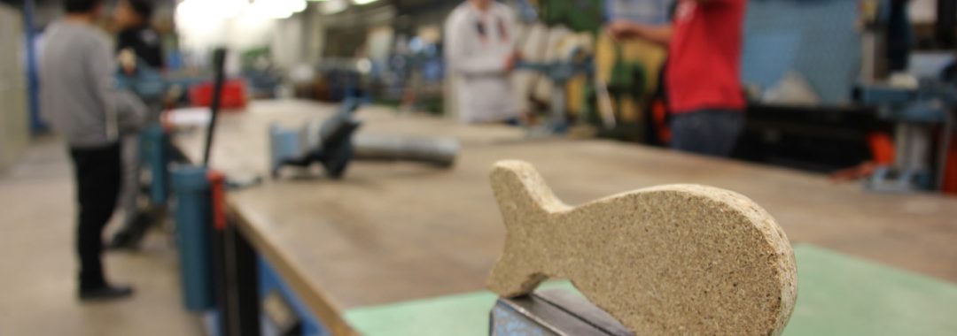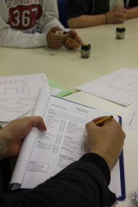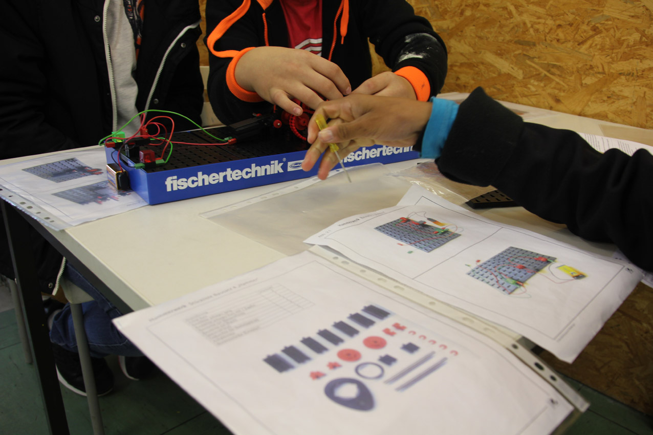 Eine Konstruktionsaufgabe mit Fischertechnik, Raspeln und Feilen eines Fisches aus Holz, exaktes Löchern von Figuren mit der Nähmaschine, Fortführen von Linien mit dem Bleistift und das genaue Schneiden von Pappe mit Cutter-Messern standen ebenso auf dem Programm wie die CNC-Steuerung von Konturen in einem Koordinatensystem am PC und das gemeinsame Erstellen eines Turms aus Pappe und Klebeband auf Zeit.