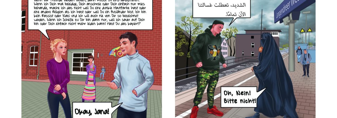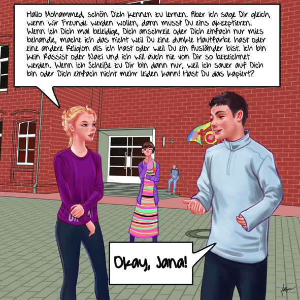 Die Aufgabe: Wie könnte ein “Frühling der Kulturen” oder die “Normalität” in Zukunft an unserer Schule ganz konkret im Alltag aussehen? Die jetzt entstandenen zwei Bilder mit ihren Protagonisten und Aussagen sollen zum Nachdenken und sofortigem Handeln anregen.