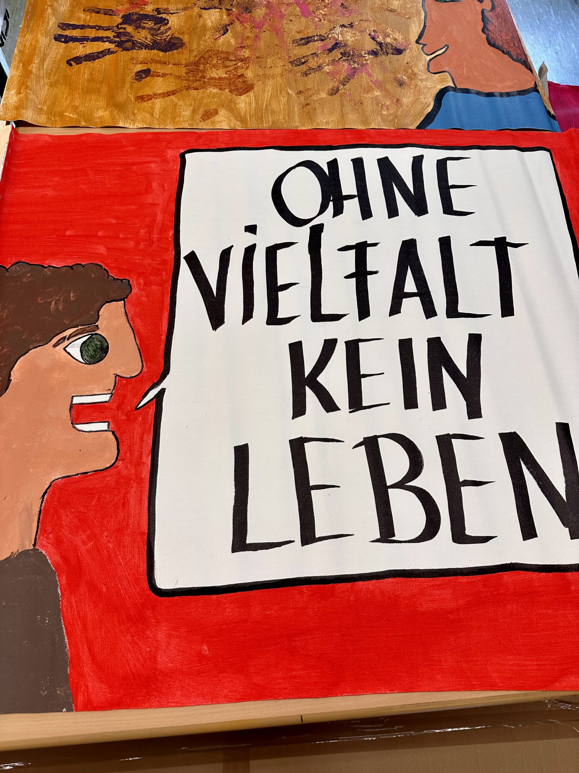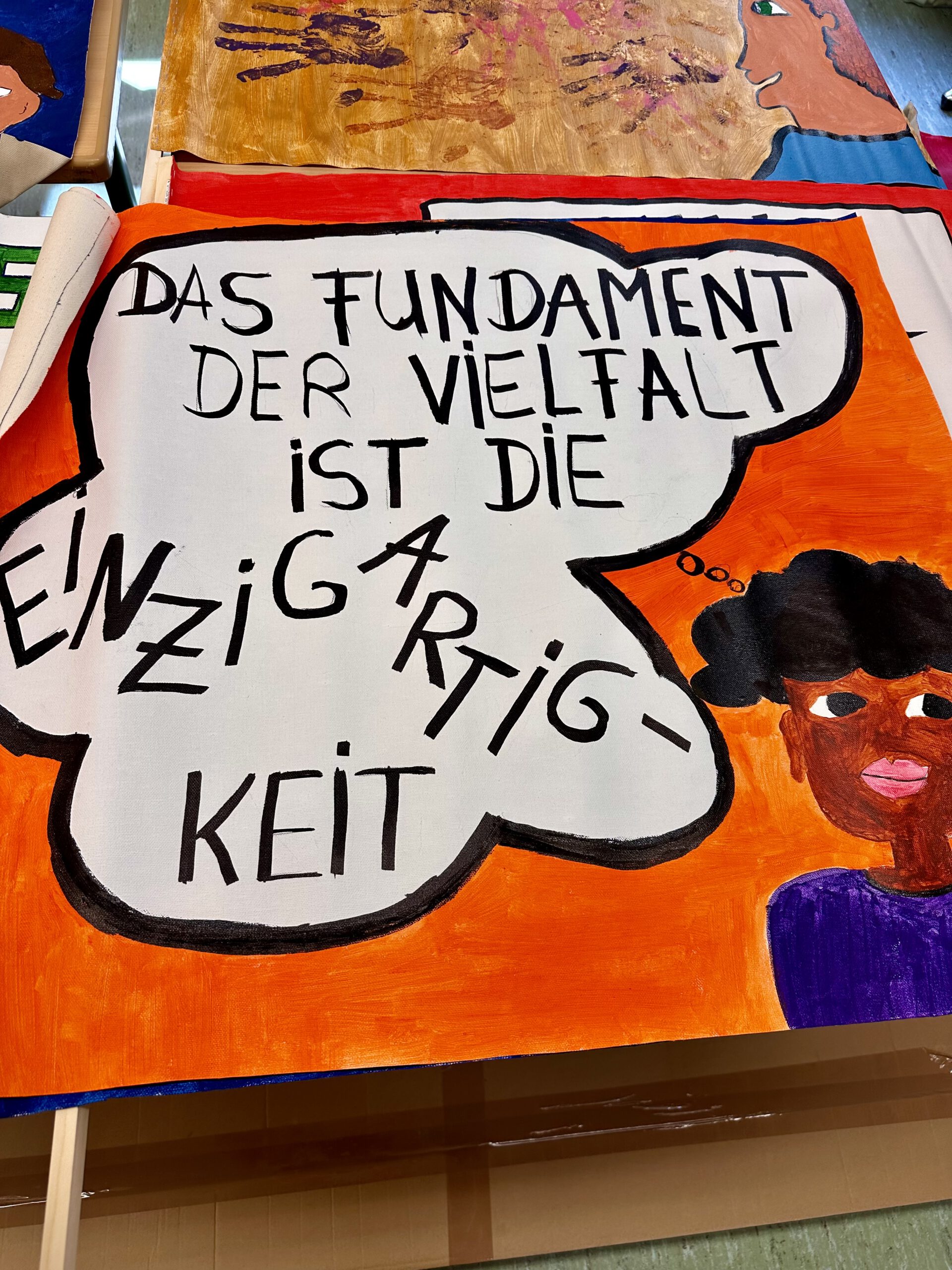 Organisiert und durchgeführt wurde die Projektwoche von den Falkenmitarbeiterinnen Frau Schindler und Frau Ciegotura, die das Projekt begleitet haben. Gemeinsam mit den Kindern und Jugendlichen wurden dort individuelle Transparente, Banner und Plakate gestaltet – jedes einzelne mit einer klaren, persönlichen Botschaft gegen Ausgrenzung und für ein respektvolles, solidarisches Miteinander.